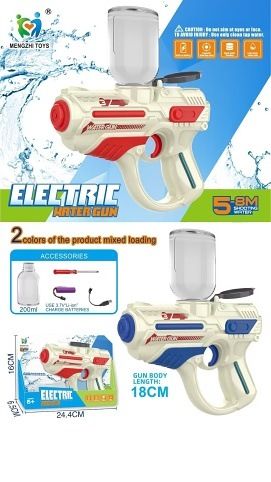 Pistole vodní elektrická. Velikost 18 cm. Zásobník na 200 ml. Dostřel 5 - 8 metrů. 1x3. 7V bateriový pack součástí, USB nabíjecí kabel součástí. , šroubováček na otevření krytky. 2 varianty - modrá, červená.