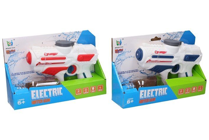 Pistole vodní elektrická. Velikost 18 cm. Zásobník na 200 ml. Dostřel 5 - 8 metrů. 1x3. 7V bateriový pack a USB nabíjecí kabel součástí, šroubováček na otevření krytky. 2 varianty - modrá, červená.