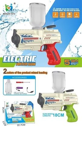 Pistole vodní elektrická. Velikost 18 cm. Zásobník na 200 ml. Dostřel 5 - 8 metrů. 1x3. 7V bateriový pack součástí, USB nabíjecí kabel součástí. , šroubováček na otevření krytky. 2 varianty - červená, zelená.