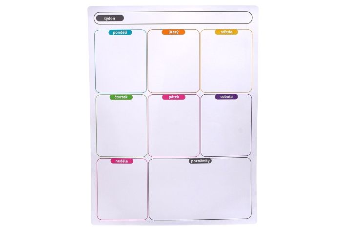 Pro přehled ve schůzkách, snadnější plánování pracovního týdne či zapisování školních úkolů je magnetický týdenní plánovač ideální. Kdykoliv můžete použitím suché stěrky napsaný text smazat a přepsat stírací fixou.