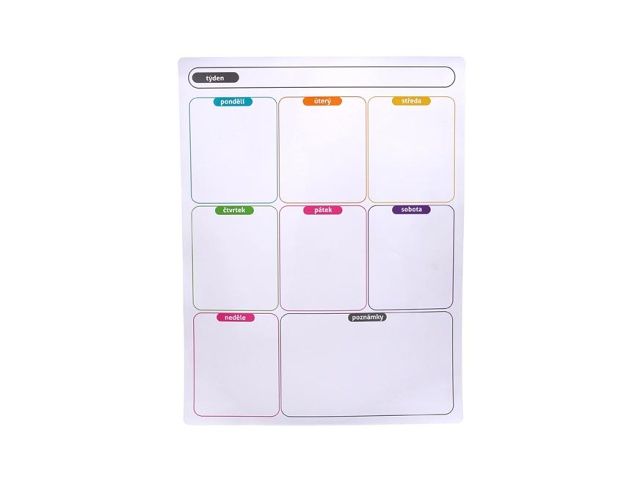 Plánovací magnetický týdenní kalendář. Ideální pro zapisování domácích úkolů, schůzek a plánování celého týdne. Lze na něj psát stírací fixou, kterou pak snadno pomocí suché stěrky smažete. Díky tomu je opakovatelně použitelný. Uvedená cena je za 1 ks.
