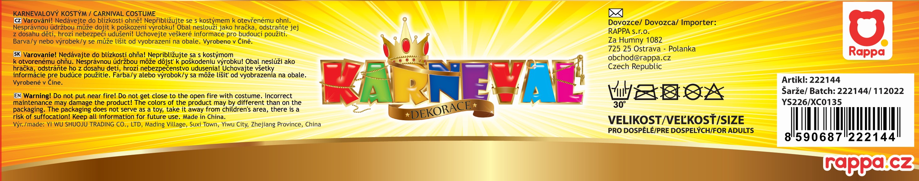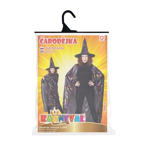 Úžasný černý plášť pro všechny čaroděje a čarodějnice! Plášť je určen pro dospělé a je dekorován potiskem barevných pavučin. Součástí kostýmu je perfektně sladěný klobouk. Plášť je dlouhý cca 140 cm. Ideální na karneval nebo halloweenskou párty.