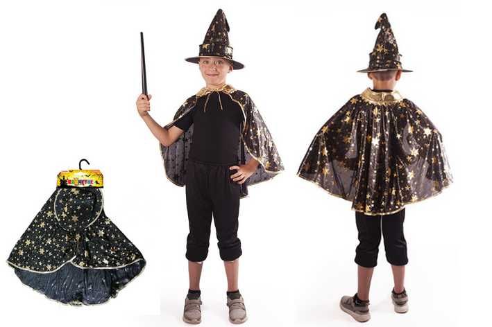 Balení obsahuje čarodějnický plášt černé barvy se zlatým lemováním a hvězdami a perfektně sladěný klobouk. V těchto exkluzivních doplňcích tě zaručeně nikdo nepřehlédne! Určeno pro děti od 3-8 let.