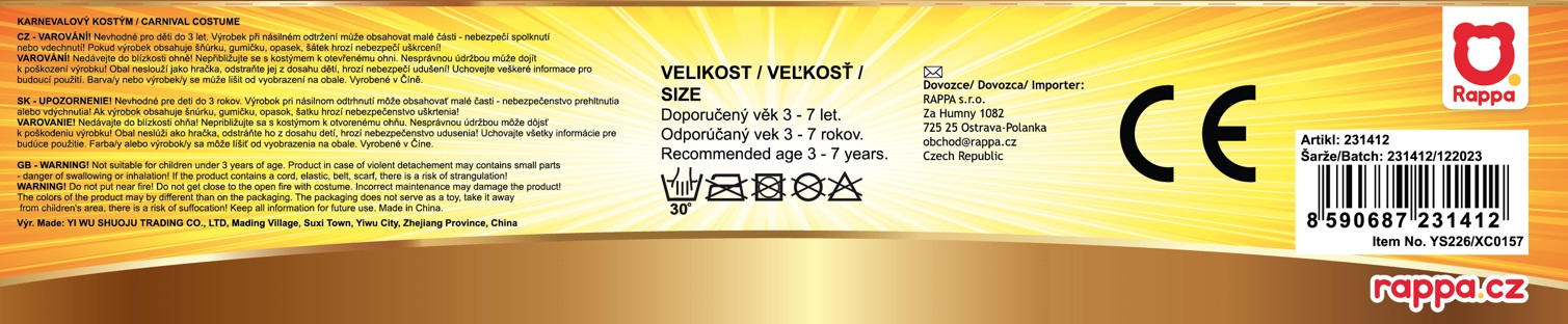 Perfektní souprava pro všechny čarodějnice nebo čaroděje na párty, karneval nebo oslavu Halloweenu! Balení obsahuje čarodějnický plášť černé barvy se zlatým lemováním a hvězdami a perfektně sladěný klobouk. V těchto exkluzivních doplňcích tě zaručeně nikdo nepřehlédne! Určeno pro děti od 3-7 let. Délka 72 cm. Hůlka není součástí balení.