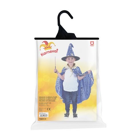 Perfektní souprava pro všechny čarodějnice nebo čaroděje na párty nebo karneval! Balení obsahuje čarodějnický plášt modré barvy se zlatým lemováním a hvězdami a perfektně sladěný klobouk