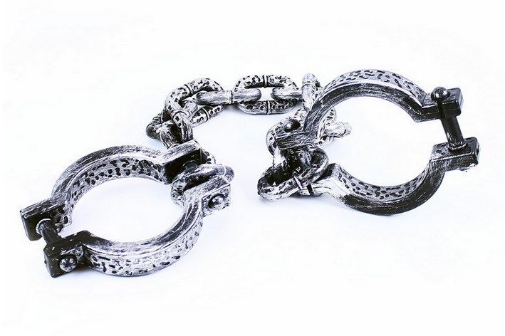 Plastové okovy s řetězem v imitaci kovu. Celková délka cca 95 cm.