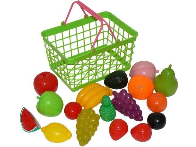 Košík nákupní z plastu, který obsahuje 20 kusů plastového ovoce