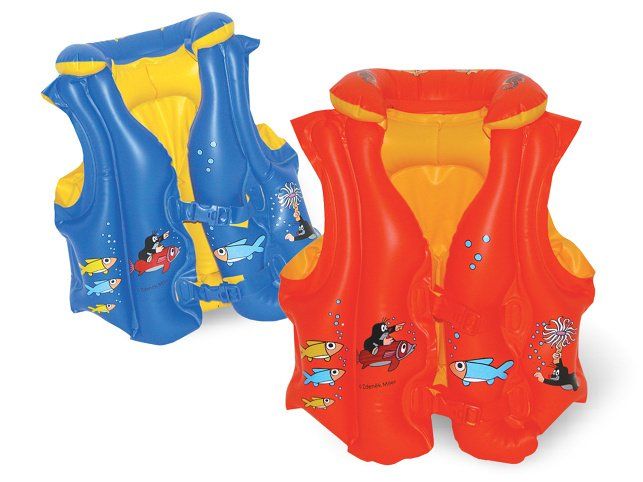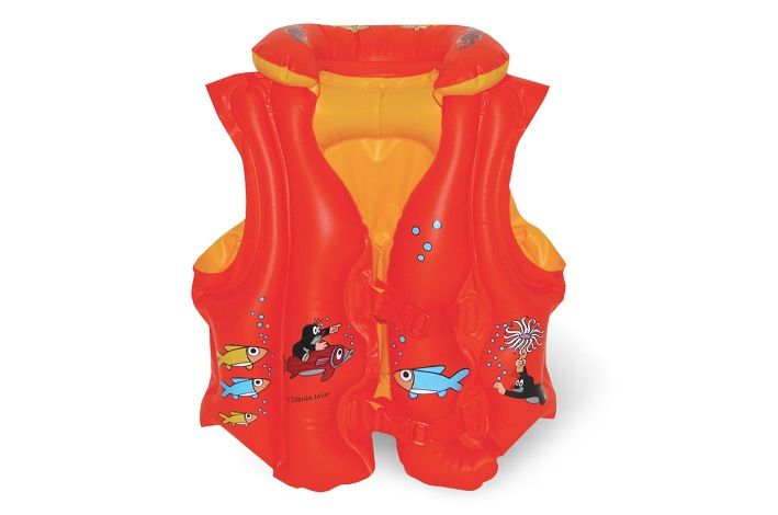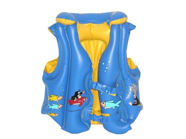 Dětská plavací vesta s motivy Krtečka a jeho kamarádů je skladná, bezpečná, snadno se nafukuje a vyfukuje. Je bez ftalátů a s bezpečnostními ventily. Děti mohou využít vestičku buď ke hře ve vodě nebo k výuce plavání. Vesta má nafukovací límce a nastavitelné přezky.