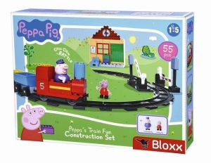 Velká vlaková souprava s elektrickou lokomotivou z řady PlayBig Bloxx v licenci Peppa Pig. Balení obsahuje koleje, lokomotivu se zvukem motoru a 2 vagónky. Součástí figurky dědy a Peppy. 55 dílů. Kompatibilní s jinými známými herními kostičkami. Rozměry: 83 x 16,5 x 62 cm.