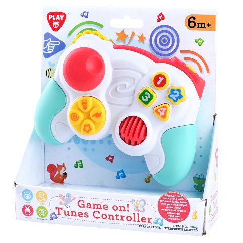 Gamepad s efekty. Rozměry 14,5x5,5x10,5 cm. Zvukové efekty. 2xAAA baterie součástí. Přepínač vlevo nižší hlasitost, uprostřed vypnuto, vpravo vyšší hlasitost. Joystick a 4 tlačítka se zvukovými efekty, cvakající otočné kolečko