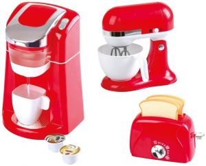 Kuchyňské vybavení TRIO - červené SADA SPOTŘEBIČU do KUCHYNĚ S FUNKCÍ s kávovarem, mixérem a toustovačem, Kuchyňský mixér je skvělý pomocník do každé dětské kuchyňky. Vyrobeno z vysoce kvalitního a odolného plastu. Funguje na 2×AA baterie, které nejsou součástí balení. (kávovar a mixér) Mixéru 16 x 12 x 19 cm + 2 nástavce Toustovač inkl. toustový chléb 2ks, ca. 16 x 7,5 x 19 cm Kávovar inkl. kapsle a tank na vodu. Sada obsahuje kávovar, topinkovač a mixér.