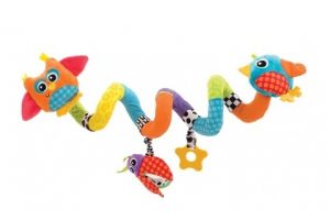 Měkká textilní spirála se snadno omotá kolem rukojeti kočárku nebo autosedačky. Během jízdy se na spirále budou pohupovat měkká textilní zvířátka, která překvapují i svými zvuky – hračky zvoní a nebo chrastí. Na spirále visí i zrcátko, se kterým děti mohou krát hru na jukanou. Při růstu zoubků oceníte i kousátko ve tvaru hvězdičky. Různé barevné materiály a vzory podporují zrak, rozmanité struktury materiálů dětský hmat. Věk 0+