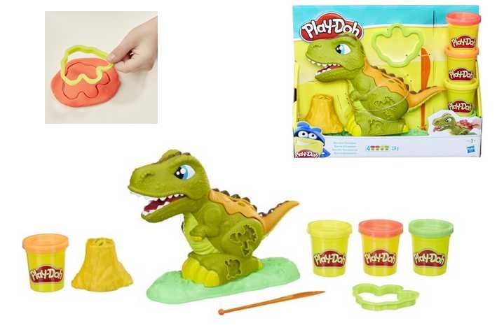 Fantazie bude s tímto veselým dinosaurem přímo vřít! Dinosaurus Rex je připraven ke hře se zábavnými funkcemi, příslušenstvím a 4 kelímky modelíny Play-Doh. Vytvořte jazyk a pusu tím, že naplníte dinosaurova záda modelínou Play-Doh a zatlačíte na ocas, který mimo to aktivuje pohyb čelisti! Pro ještě větší dino-zábavu vytvořte stopy řezačkou a vytlačte Play-Doh lávu přímo ze sopky!
