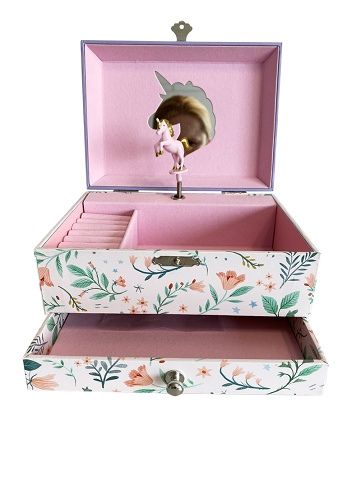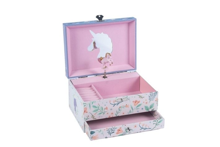 Hrací skříňka s jednorožcem, který se točí. Skříňka po otevření hraje a jednorožec se točí. Vyrobeno z tvrdého odolného papíru.