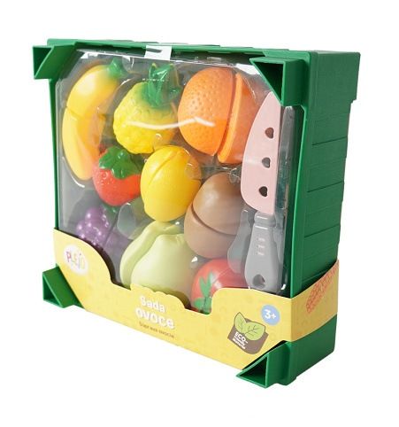 Sada ovoce v bedýce, která se dá skládat na sebe. Ovoce je na suchý zip a lze ho přiloženým nožem rozříznout. Sada obsahuje 19 ks.