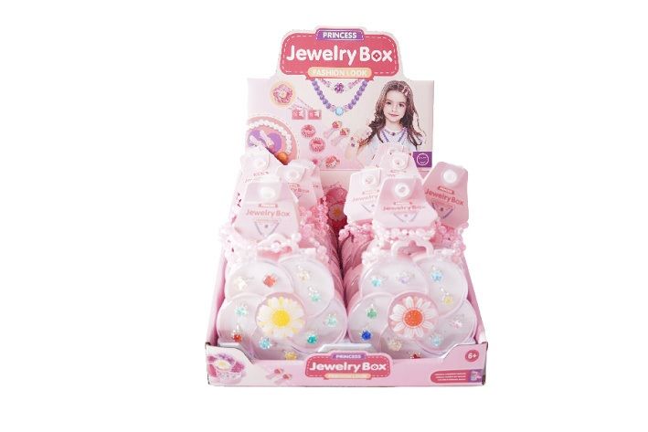 Sada prstýnků v krabičce ve tvaru kytičky. Sada obsahuje 10 nastavitelných prstýnků s různými barevnými kaminky.