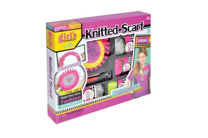 Pletací stav Scarf design - navrhni a vyrob si vlastní šálu nebo jiné doplňky. Použij dodané barvy vlny nebo je nahraď tvými oblíbenými odstíny.