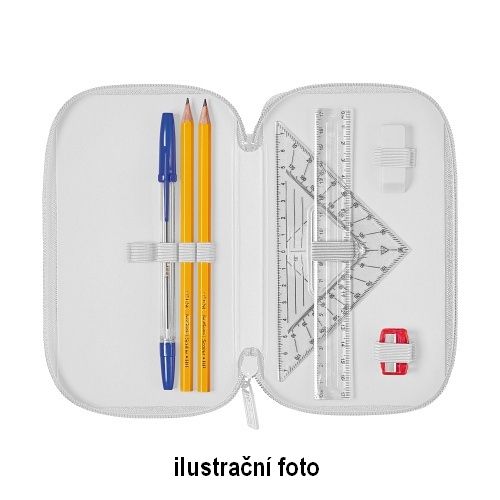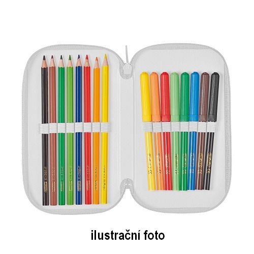 19 x 11 x 4,5 cm, 23 dílů - 8 fixů, 8 pastelek, 2 tužky, ořezávátko, guma, kuličkové pero, 16 cm pravítko, trojúhelník, materiál: polyester