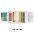 20,3 x 14 x 3,5 cm, 31 dílů - 14 fixů, 8 šestihranných pastelek, 2 tužky, ořezávátko, guma, 16 cm pravítko, trojúhelník, kuličkové pero, rozvrh hodin, vizitka, materiál: polyester