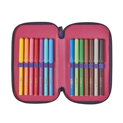 19,3 x 11,5 x 7 cm, 31 dílů - 14 fixů, 8 pastelek, 2 tužky, ořezávátko, guma, 16 cm pravítko, trojúhelník, úhloměr, pravítko - šablona, kuličkové pero, materiál: polyester