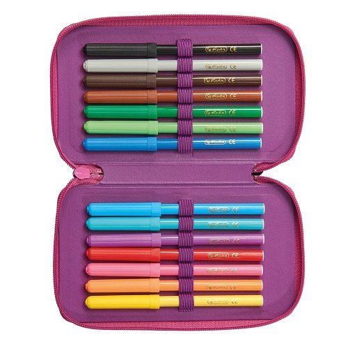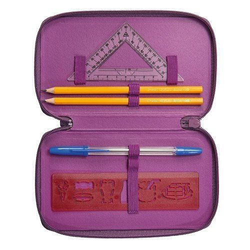 19 x 11,5 x 7 cm, 31 dílů - 14 fixů, 8 pastelek, 2 tužky, ořezávátko, guma, 16 cm pravítko, trojúhelník, úhloměr, pravítko - šablona, kuličkové pero, materiál: polyester