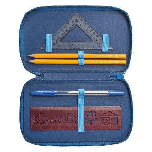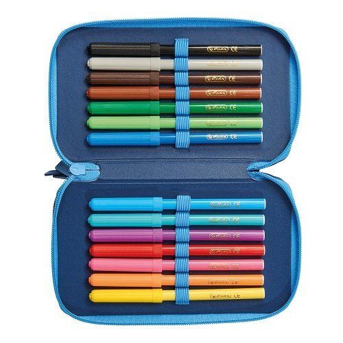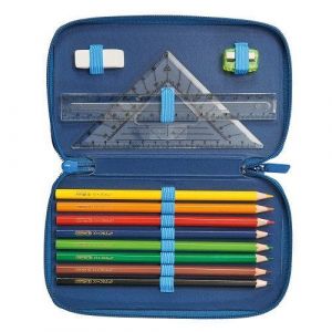 19 x 11,5 x 7 cm, 31 dílů - 14 fixů, 8 pastelek, 2 tužky, ořezávátko, guma, 16 cm pravítko, trojúhelník, úhloměr, pravítko - šablona, kuličkové pero, materiál: polyester