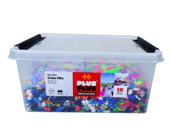 Praktický úložný box obsahuje celkem 6000 dílků Plus-Plus. Z toho 3600 dílků v základních barvách, 1200 dílků v neonových barvách a 1200 dílků v pastelových barvách. Součástí je i brožura s konkrétními zadáními a úkoly pro děti. Vyrobeno v Dánsku, bez ftalátů, recyklovaný plast, snadná údržba. Rozměr boxu 40×30×19 cm. Ideální pro kolektivy. Vhodné od 5 let.