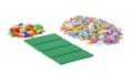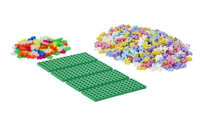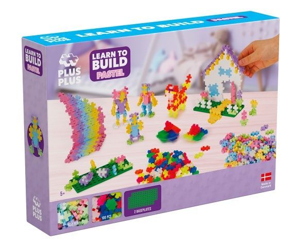 Kreativní sada PLUS-PLUS Nauč se stavět Pastel obsahuje 500 pastelových dílků, 100 dílků neonových a 4 malé základní desky. Podle návodu můžete vytvářet obrázkové mozaiky, ale i 3D modely – zvířata, postavy, budovy apod.