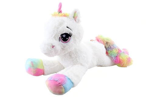 Plyšový ležící jednorožec - bílý s duhovými doplňky. Rozměry cca 80x45x23 cm. Věk 0+