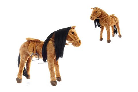 Velký plyšový kůň s uzdičkou a otěžemi. Kůň má stabilní kostrukci na hraní i sezení. Nosnost 100 kg. Kůň při zmačknutí ouška řehtá a vydává zvuky klusu. Baterie 2xAA jsou součástí balení. Rozměry cca 70 x 60 x 22 cm. Věk 3+