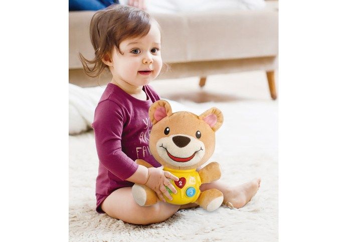 Plyš medvěd s efekty. Velikost 17 cm. Vydává světelné a zvukové efekty (hudba). Aktivace tlačítky na bříšku (srdíčko - melodie, kulaté - zvukové efekty, květina - zvuky přírody). 2xAAA baterie (nejsou součástí).
