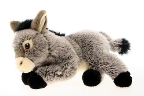 Plyšový oslík ležící na boku. Rozměry cca 28 x 19 cm. Věk 0+