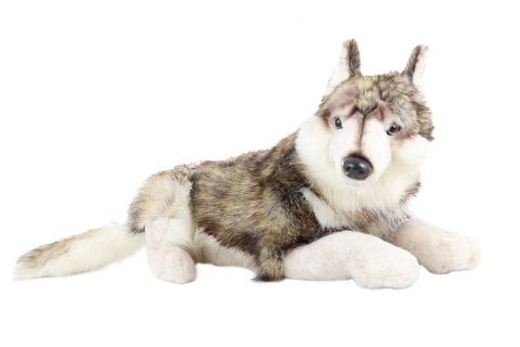 Plyšový vlk ležící o rozměru cca 100 x 37 x 30 cm. Věk 0+