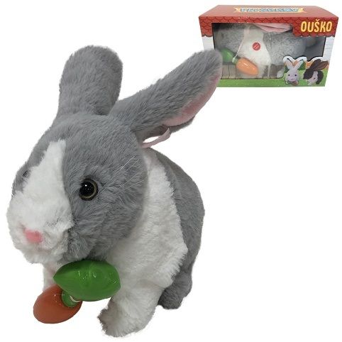 Hopsá, stříhá ušima a hýbe čumáčkem. Při přiblížení mrkvičky k čumáčku vydává zvuky, jako když ji okusuje.