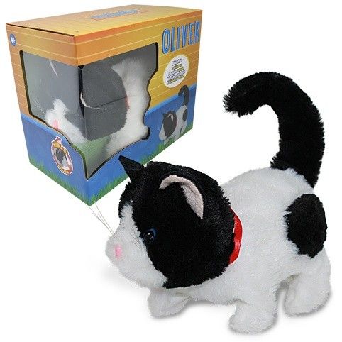 Interaktivní kočička s tlačítkem, které má umístěné na zádech. Funkce: Vytáhni pojistku ze zásobníku pro baterie. Přepni vypínač ON/OFF a aktivuj funkce stiskem tlačítka (po určitém čase se funkce automaticky ukončí, proto dané tlačítko stiskni znovu). Tvá kočička začne hýbat ocáskem, chodit a také mňoukat! Ošetření látky: ruční čištění navlhčeným hadříkem ve vlažné, čisté nebo mýdlové vodě. Výrobek na baterie : 2× baterie „AA“ 1,5V. Baterie jsou součástí hračky – pouze pro zkušební provoz.