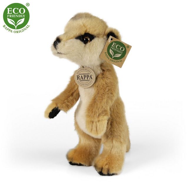Roztomilá plyšová surikata stojící ve velikosti 23 cm. Surikata je vyrobena z vysoce kvalitní plyše a je tak součástí exkluzivní kolekce plyšových hraček RAPPA. Rozhodli jsme se jít zelenou cestou co nejméně zatěžující životní prostředí - cestou ECO-FRIENDLY. Co to vlastně ECO-FRIENDLY znamená? Výplň plyšové hračky je vyrobena z recyklovaných PET lahví. Tento materiál je zcela bezpečný, na omak nerozeznatelný od standardní výplně a plně atestovaný pro bezpečnost i těch nejmenších.