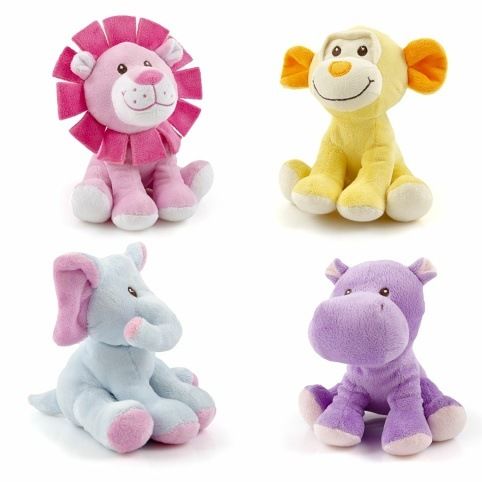 Pyšlová zvířátka z džungle 15 cm – ve čtyřech barevných provedeních fialový hroch, žlutá opička, růžový lev a modrý slon.
