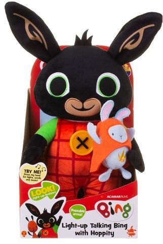 Česky mluvící BING populární pohádky králíček Bing ti řekne více než 15 zábavných frází! Rozkošná plyšová hračka umí dokonce i svítit a má u sebe svého věrného kamaráda Hoppity. Bing miluje dobrodružství, ať už je to výlet do parku nebo den ve školce, bude ti perfektním společníkem. Stiskněte Bingovo bříško a pozorujte, jak vypráví a chichotá se. Bing je vyroben z měkkých texturovaných tkanin a má krásně vyšívané detaily. Součástí balení jsou 3AA baterie, které se dají vyměnit.