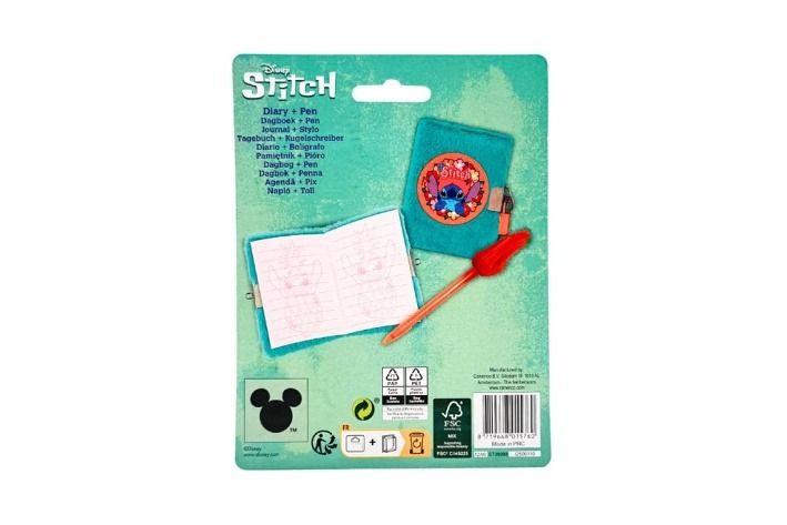 Kouzelný deník s motivem oblíbeného filmu Stitch. Deník má měkké plyšové desky, které působí příjemně na dotek, a je uzavíratelný na malý ozdobný zámek s klíčky, takže všechny tajné zápisky zůstanou v bezpečí. Součástí je také stylové chlupaté pero, díky kterému je psaní ještě zábavnější.