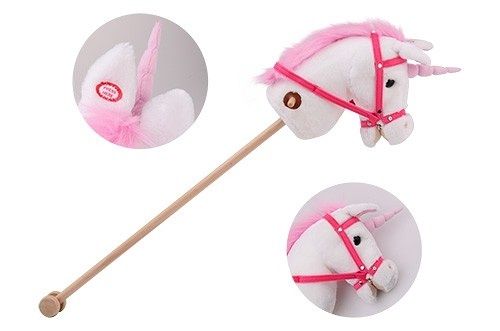 Plyšový Jednorožec na tyči s uzdou a zvukem. Hlava Jednorožce je vyrobena z hebké plyše, tyč z tvrdého dřeva. Po zmáčknutí tlačítka na krku Jednorožec vydává zvuky. Na baterie: 3x LR44 (jsou součástí balení)