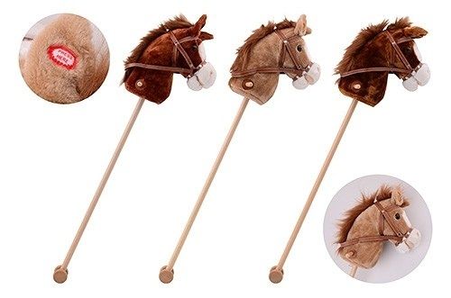 Plyšový koník na tyči s uzdou a zvukem. Hlava je vyrobena z hebké plyše a tyč z tvrdého dřeva. Po zmáčknutí tlačítka na krku koník vydává zvuky. Baterie součástí balení. Ve třech různých barevných provedeních. Na baterie: 3x LR44 (jsou součástí balení)