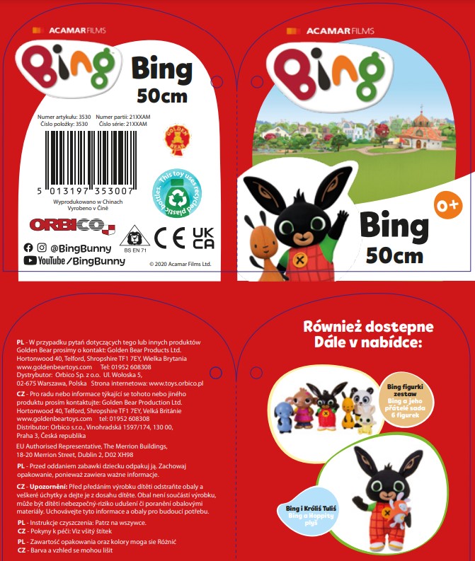 Bing je hlavní postava britského animovaného seriálu a jistě se rychle stane jedním z nejoblíbenějších a největších mazlíčků vašeho dítěte. Tento plyšový králík je díky měkkému, na dotek příjemnému materiálu a vyšívané tváři bezpečný i pro nejmenší děti. Bude to skutečná ozdoba každého dětského pokoje. Králík měří 65 cm i s ušima, bez uší 50 cm. Vhodné pro děti od 10 měsíců.