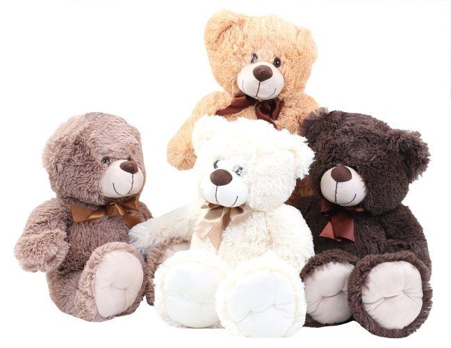 Plyšový medvěd s mašlí o velikosti přibližně 50 cm. Vyrobeno z kvalitní plyše. Ve čtyřech barevných provedeních – bíly, béžový, světle a tmavě hnědý.