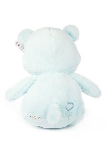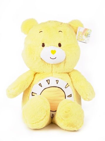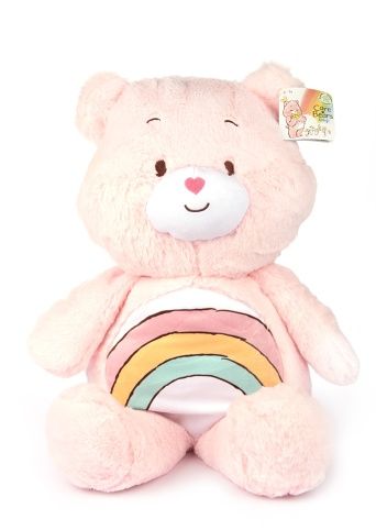 Plyšový medvídek na spaní s duhou na bříšku – velikost 63 cm. Je vyroben z jemné plyše, ve třech barevných probedeních, růžový, světle modrý a žlutý.