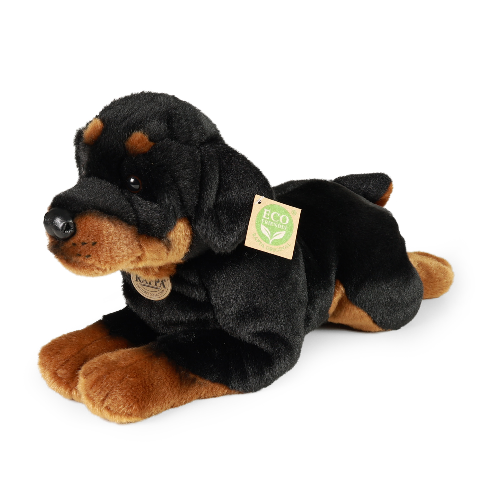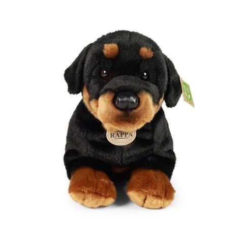 Roztomilý plyšový pes rotvajler ve velikosti 39 cm může být ideálním dárkem pro každého, kdo má rád zvířata nebo miluje přírodu. Je vyroben z měkkého a jemného materiálu, který je příjemný na dotek a je tak součástí exkluzivní kolekce plyšových hraček RAPPA. Co to vlastně ECO-FRIENDLY znamená? Výplň plyšové hračky je vyrobena z recyklovaných PET lahví. Tento materiál je zcela bezpečný, na omak nerozeznatelný od standardní výplně a plně atestovaný pro bezpečnost i těch nejmenších. Rozhodli jsme se jít zelenou cestou co nejméně zatěžující životní prostředí- cestou ECO-FRIENDLY.