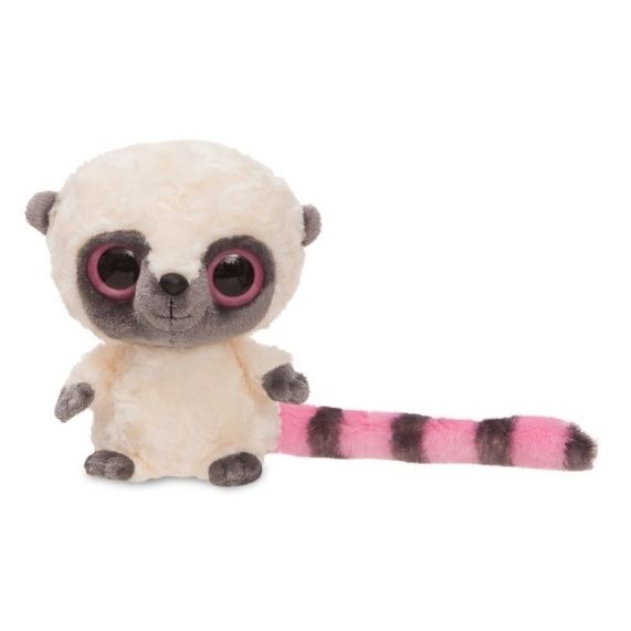 Plyšový YooHoo s růžovýma očima a proužkovaným ocasem v růžové a
