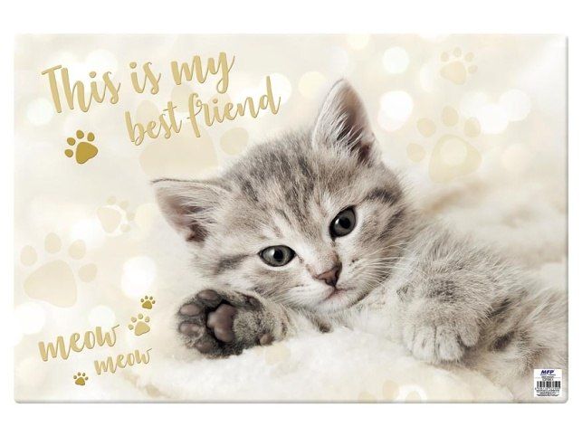 Psací podložka na stůl s obrázkem kočky. Slouží jako podklad pod kreslení, modelování a jiné tvůrčí činnosti. Chrání nábytek proti poškození a je praktickým pomocníkem školáka. Podložka je vyrobena z papíru, který je zatavený v pevném plastovém obalu. Podložka je velice dobře omývatelná, stačí setřít vlhkým hadříkem. Odolná proti pokreslení pastelkami. Uvedená cena je za 1 ks.