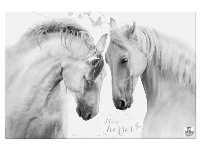 Psací podložka na stůl s obrázkem koňů. Slouží jako dekorace do pokojíčku, může sloužit jako podklad pod kreslení, modelování a jiné tvůrčí činnosti. Chrání nábytek proti poškození a je praktickým pomocníkem školáka. Podložka je vyrobena z papíru a zatavená v pevném plastovém obalu. Podložka je velice dobře omývatelná, stačí setřít vlhkým hadříkem. Odolná proti pokreslení pastelkami. Uvedená cena je za 1 ks.
