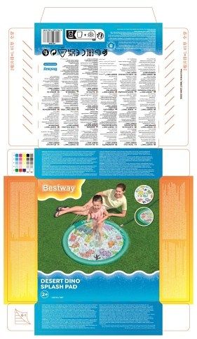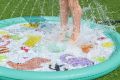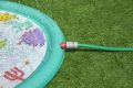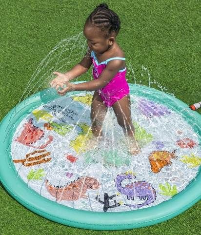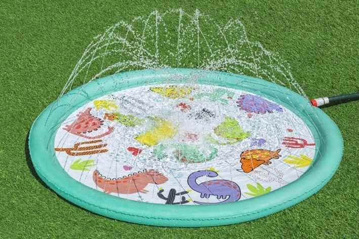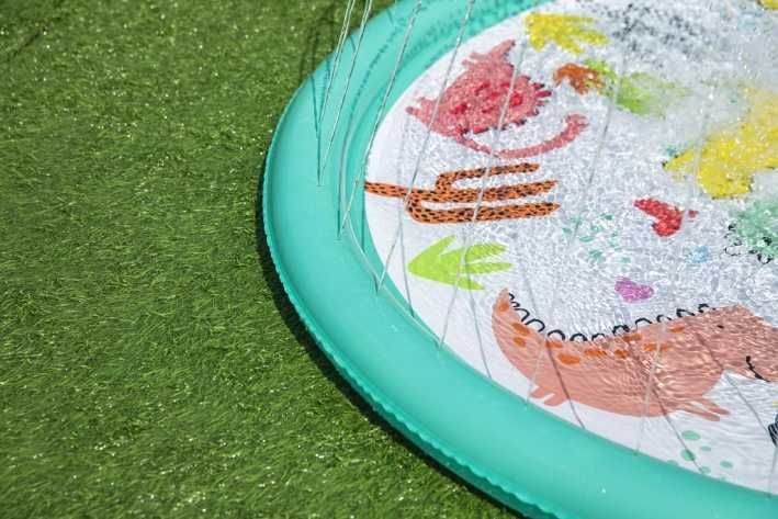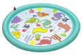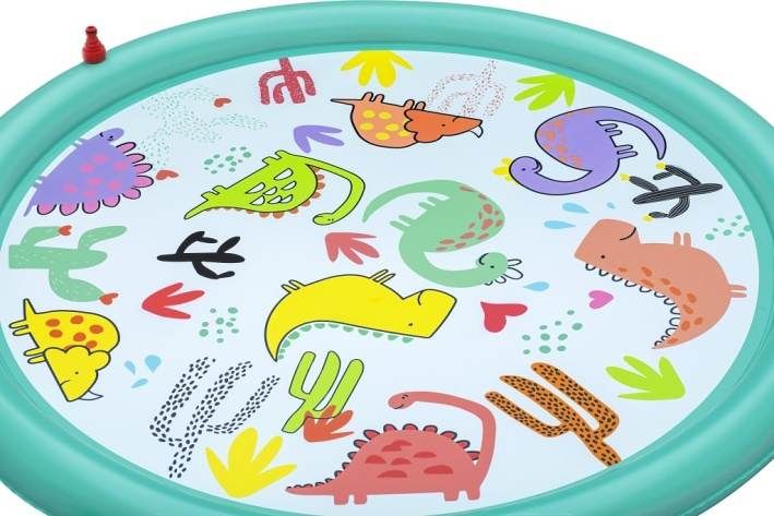 Podložka stříkací dinosauři je venkovní hračka určená především pro malé děti od 2 let, která nabízí zábavné a osvěžující chvíle během teplých letních dnů. Má kruhový tvar o průměru 122 cm a je vyrobena z pevného, odolného materiálu v pastelově zelené barvě. Povrch podložky zdobí barevné a hravé motivy dinosaurů a kaktusů, které podporují dětskou představivost a přinášejí hravý prvek do hry s vodou. Podložka je navržena tak, aby se snadno připojila k zahradní hadici, což umožňuje rychlé a jednoduché spuštění vodních trysek. Voda stříká jemnými proudy ze zakončení nafukovacího okraje podložky, čímž vytváří fontánkový efekt, který děti může stimulovat k pohybu a hře přímo na povrchu podložky. Proud vody je možné regulovat, což zvyšuje její bezpečnost a přizpůsobivost potřebám dítěte. Díky kompaktním rozměrům je podložka vhodná i do menších zahradních prostor nebo na terasu. Je stabilní a bezpečná, přičemž součástí balení je i opravná záplata pro případ drobných poškození, která zajišťuje delší životnost produktu. Podložka tak představuje ideální způsob, jak dětem zpříjemnit horké počasí a zároveň je zabavit aktivní a interaktivní formou hry s vodou.