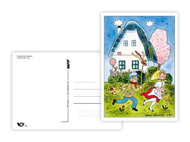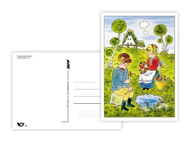 Velikonoční pohlednice s krásnou ilustrací od Aleny Ladové. Pohledy jsou bez textu na zadní straně. Papír: pohlednicový karton 300 g Text: 0/6 Uvedená cena je za 1ks.